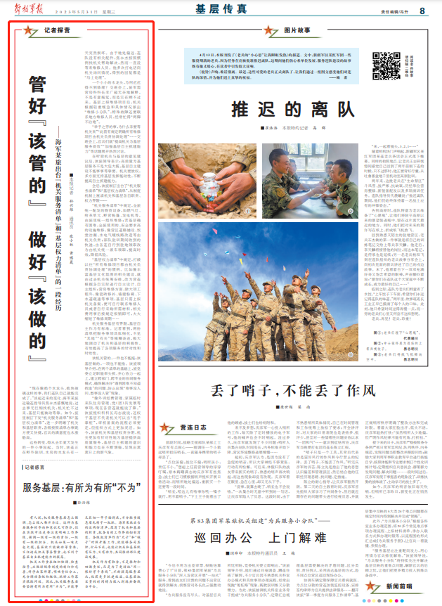 会后,该旅制订出台了“机关服务清单”和“基层权力清单”,从制度机制上厘清机关和基层各自职责、权力界限——