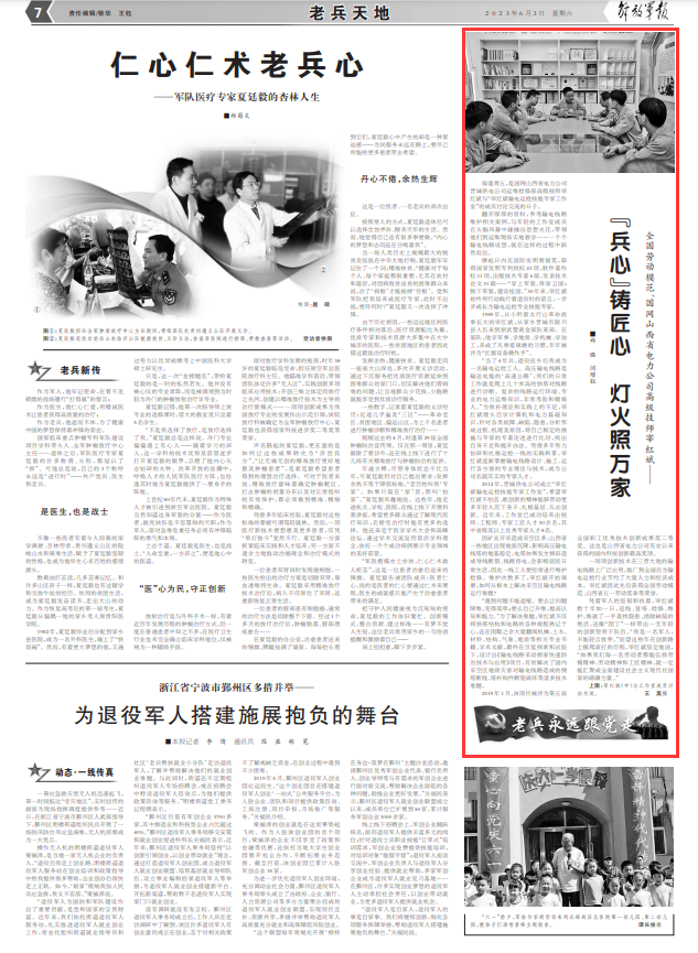 捧起日内瓦国际发明展银奖,取得国家发明专利授权23项、软件著作权11项,出版技术专著6部,发表技术论文31篇……“穿上军装,保家卫国;脱下军装,建设祖国。”30年来,宰红斌始终用行动践行着退役时的诺言,一步步成长为输电运检专业技能专家。