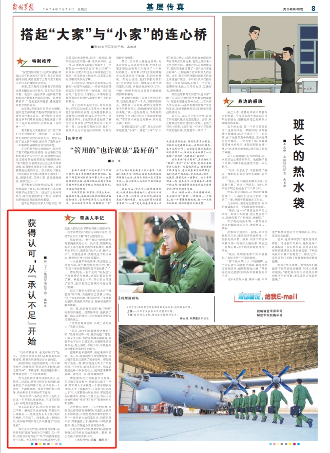 这件事后,我放下了心中的包袱,直面自己存在的短板弱项:对连队主战专业不够熟悉、开展思想政治教育招法不多……我开始主动向连长学、向班长骨干学、向普通战士学,像海绵一样吸收着营养,努力实现能力素质转型升级。
