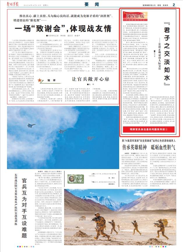 钱钟书先生最推崇的交往之道是“素交”,他曾说:“在我一知半解的几国语言里,没有比中国古语所谓‘素交’更能表出友谊的骨髓。一个‘素’字把纯洁真朴的交情的本体,形容尽致……”“素交”,也就是我们常说的“君子之交淡如水”。水虽淡,久而味长;醴虽浓,久而怨起。每名官兵特别是领导干部,应坚持有境界的交往,反对低俗、媚俗、庸俗之交;坚持有底线的交往,反对违规、违纪、违法之交;坚持有品位的交往,反对功利、势利、唯利之交。主动给自己装上“防火墙”“过滤网”,管好自己的嘴,不该吃的饭不吃;管好自己的手,不该拿的东西不拿;管好自己的腿,不该去的地方不去,做到心境澄明、心力茁壮,让人迎面就能感受到清澈和纯粹。
