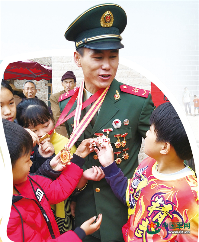 广西玉林市军地人员为两次荣立二等功的武警某部战士梁钊广家送喜报,孩子们围看梁钊广的奖章。