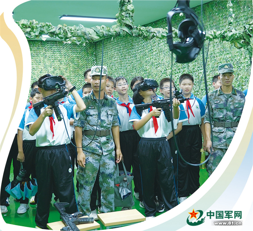 广西玉林市全民国防教育基地模拟训练馆内,中学生在体验轻武器射击。
