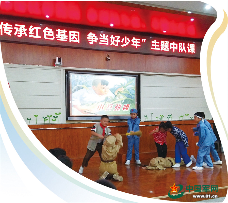 广西玉林高新区玉东小学采取多种方式开展国防教育。图为组织学生排演抗日情景剧。