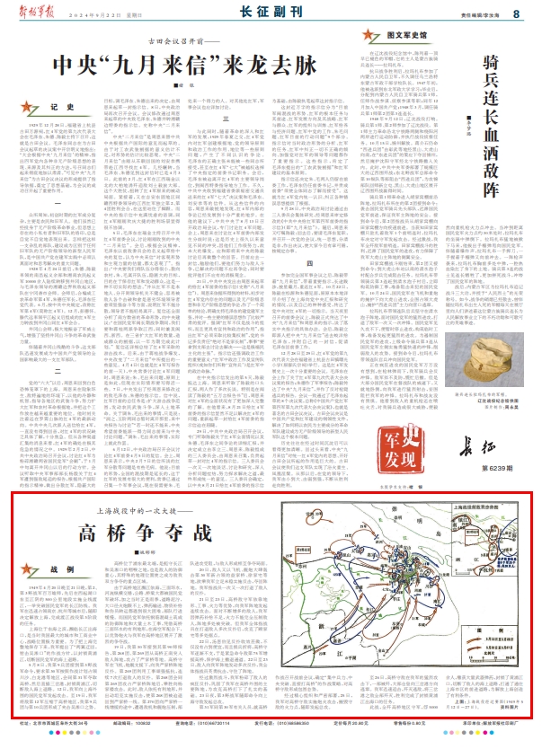 22日,汤恩伯见反扑收效甚微,不仅没有占到便宜,而且损兵折将,高桥守军逐渐不支,于是紧急命令敌第75军增援高桥,保护海上撤退通道。22日至23日,敌人向我军阵地发动多次反扑,我全体指战员英勇抗击,守住了阵地。