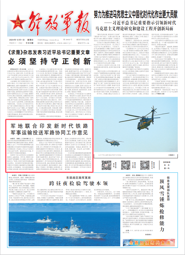解放军报讯 张楠、记者孙兴维报道:为适应军队和国家铁路调整改革形势,提高铁路军事运输投送服务备战、保障打赢能力,近日,中央军委后勤保障部与国铁集团联合印发新时代铁路军事运输投送军路协同工作意见,并在辽宁沈阳召开会议进行宣贯。意见的出台实施,开启了新时代军路协同新篇章。