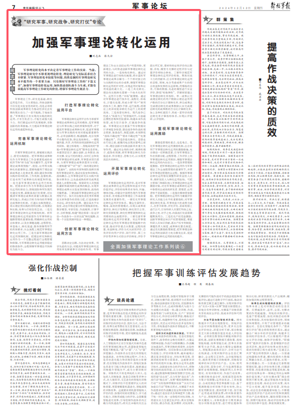 军事理论转化的水平决定着军事理论工作的实效。当前,军事理论研究中不够重视理论转化、理论研究与实际需求结合不够紧、军事理论转化率较低等问题,仍然是制约军事理论研究水平提升的一个重要方面。只有做好军事理论工作的“下篇文章”,加强军事理论转化运用,加快推动部队战斗力生成,才能有效提高军事理论工作研究的价值,增强军事理论生机活力。