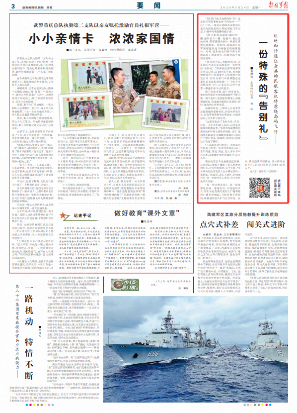 “你为国守岛,我暖你归途,这是部队为退伍老兵准备的一份特殊的‘告别礼’。”南部战区海军某部领导告诉记者,从2019年开始,桂林联勤保障中心某调度中心协调地方航空公司,向有关部门申请调整运送退伍老兵客机的航线——飞机升空后绕岛屿飞行,让老兵们从空中再看一眼他们奋斗过的地方。