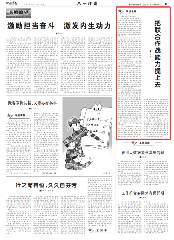 习主席在视察空降兵军时强调,要“加大同其他军兵种部队协同训练力度,推进战训深度耦合,提升联合指挥、联合行动、联合保障能力”。贯彻落实这一重要讲话精神,要求各级指挥员强化战略素养、联合素养、指挥素养、科技素养,深入研究一体化联合作战,不断创新训法战法,切实把联合作战能力提上去,确保制胜强敌对手、打赢未来战争。