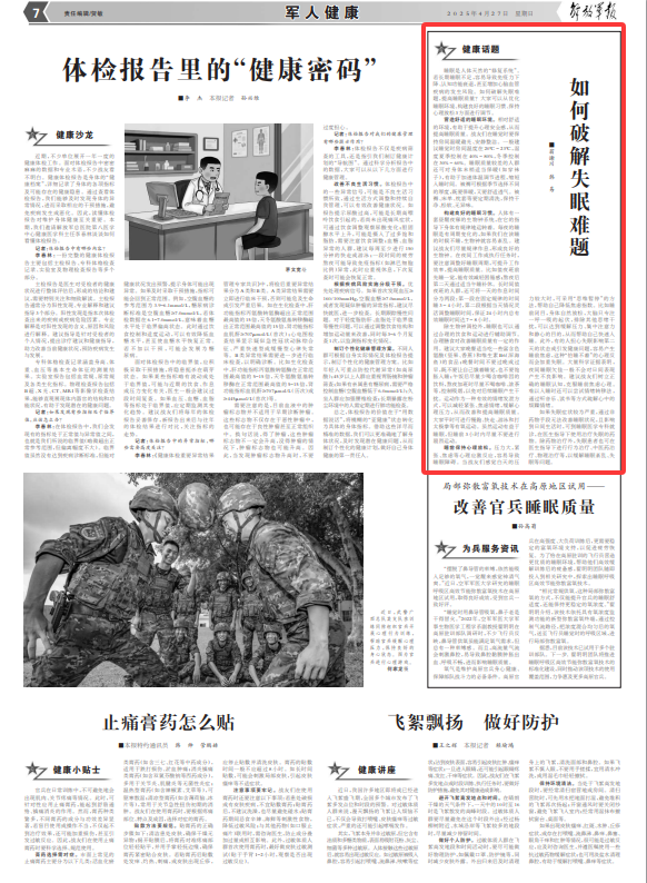 睡前保持心理放松。压力大,紧张、焦虑等心理应激反应,容易导致睡眠障碍。当战友们感觉白天的压力较大时,可采用“思维暂停”的方法,帮助自己降低焦虑指数。比如睡前闭目,身体自然放松,大脑只专注一呼一吸的起伏,排除其他思绪干扰,可以达到缓解压力、集中注意力和静心的目的,从而帮助自己快速入睡。此外,有的人担心失眠影响第二天的状态或引发健康问题,容易产生睡前焦虑,这种“怕睡不着”的心理反而会加重失眠。大量科学证据表明,夜间睡眠欠佳一般不会对日间表现产生不良影响。建议战友们树立正确的睡眠认知,克服睡前焦虑心理。难以入睡时还可以尝试情绪转移法,通过听音乐、读书等方式疏解心中的烦躁情绪。