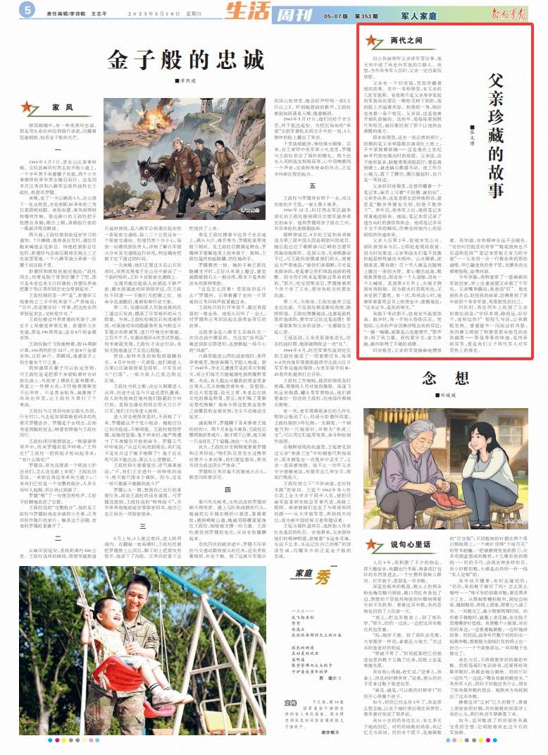 旧皮箱里,父亲的军装静静地摆放着。我知道,有些精神永远不会褪色。“受伤时仍挺直的背脊”“鞋底烧焦也不后退的坚持”“笔记本里板正有力的字迹”……父亲用一言一行教会我的那些道理,早已融进我的骨子里,支撑我攻克艰难险阻、奋勇向前。