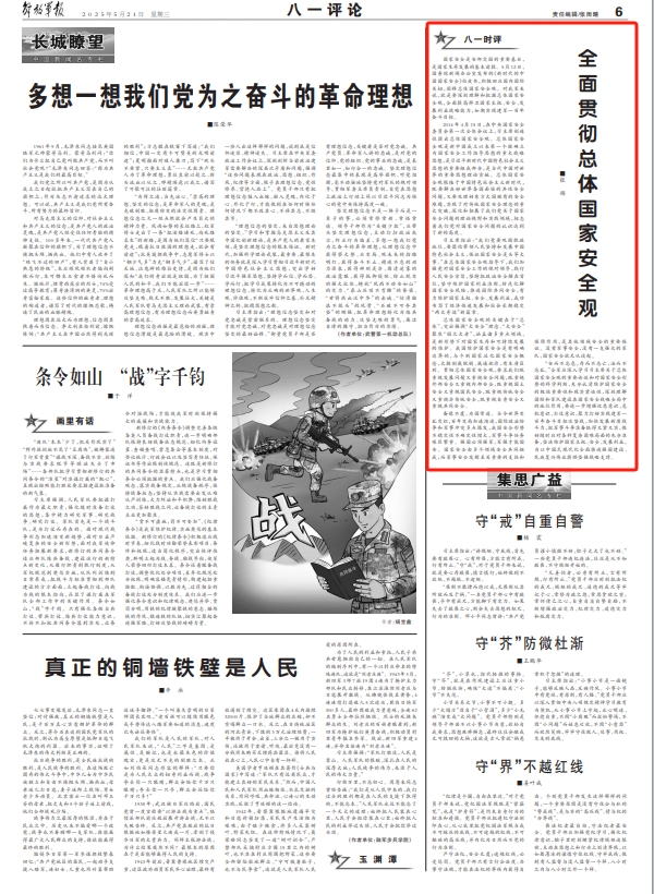 国家安全是安邦定国的重要基石,是国家生存发展的基本前提。5月12日,国务院新闻办公室发布的《新时代的中国国家安全》白皮书,积极回应国内国际关切,阐释总体国家安全观。对我军来说,就是要深刻理解和把握总体国家安全观,全面提高捍卫国家主权、安全、发展利益战略能力,如期实现建军一百年奋斗目标。