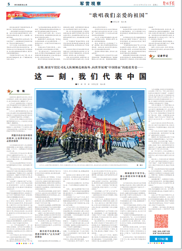 “五星红旗迎风飘扬,胜利歌声多么响亮。”《歌唱祖国》的旋律在红场响起,仪仗队员与现场观众的歌声交织成河。