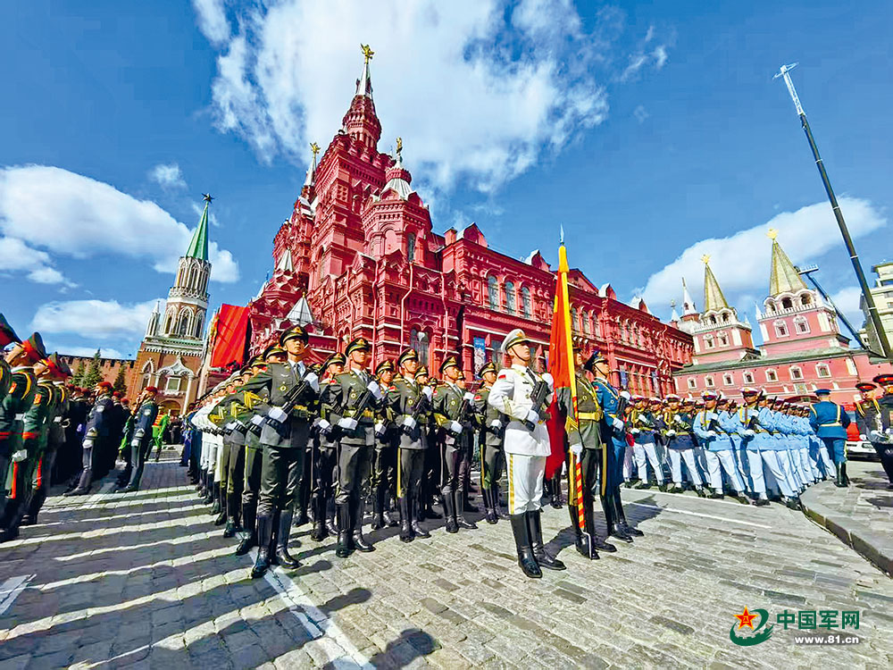 5月9日,在俄罗斯首都莫斯科,中国人民解放军仪仗司礼大队官兵在红场整齐列队,准备参加纪念苏联伟大卫国战争胜利80周年阅兵式。隋晓 摄