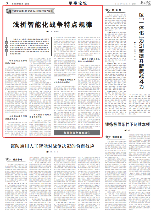 战斗力生成模式,是形成和提高战斗力的一整套相对稳定的方法、途径和标准形式。机械化战争时代,战斗力生成主要依靠的是人、武器装备的加法效应;信息化战争时代,战斗力生成主要依靠的是人、武器装备和信息的乘法效应;智能化战争时代,战斗力生成主要依靠的是人、武器装备和智能的幂数效应。以人工智能为代表的智能技术群正赋予作战体系自我学习、自我成长、自我进化的能力。其中,算法是战斗力生成的“加速器”。智能化时代的战斗力基于算法加速生成。算法的先进程度,决定了智能化装备的“聪明”程度。算法能够驱动感知要素加速态势认知,能够通过数据融合加速分析判断,能够通过精算、细算、深算和深度推理等加速决策行动。数据是战斗力生成的“倍增器”,通过算法对战斗力产生作用。数据的数量质量对战斗力的生成具有重要影响,高质量的数据多则算法智能程度高,战斗力生成就更为高效。算力是战斗力生成的“催化剂”。以往战争形态,受技术发展限制,战争计算多是粗略概算,算力是战斗力生成中不显眼的配角。智能化战争时代,算力通过算法发挥作用,显著催化战斗力生成,成为不可或缺的重要角色。近年来发展迅猛的人工智能大模型,正是基于算法的改进提升、大规模高质量数据供给、高性能算力支撑,展现出强大的自学习、可进化能力。这种能力向军事领域的迁移,必将对战斗力生成模式产生巨大影响。以往只有生物有机体才具有的自学习、可进化的自然能力,将成为智能化作战体系的必备能力,并由此显著区别于信息化作战体系。
