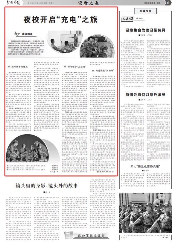 三级军士长王海坤:我担任“兴趣夜校”的教员快半年了,最大的体会是“教学方法选对了,课就活了”。刚开始授课时,我按照维修手册目录给年轻战友讲解装备结构原理,发现课堂气氛比较沉闷。后来,我翻出自己当年刚学维修时的笔记,想起老班长总拿损坏的零件让我“摸透再学”,我就琢磨出新的授课方法:提前征集“故障清单”,了解什么装备容易损坏、战友们想学习什么维修内容,然后我带着教具现场拆、现场修。