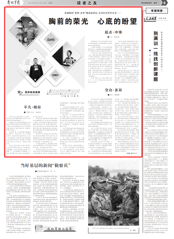 看得见的胸前荣光,看不见的心底滚烫。虽然我的“胸前荣誉墙”还是空白,但大家都说“空白纸张能画出多彩的图案”,我期冀着像班长们那样,在三尺机台当好联通千军万马的通信兵,为青春留下闪亮印记。