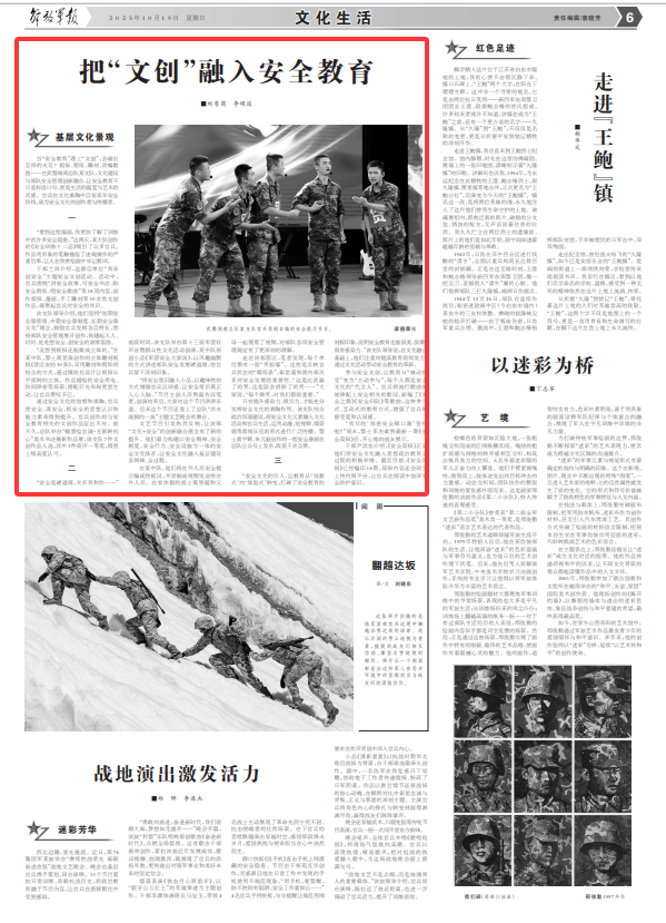 干部兰剑介绍,这源自单位“我来创安全”主题安全文创活动。活动中,官兵围绕“讲安全故事、写安全书法、贴安全剪纸、唱安全歌曲”等15项内容,创作板报、漫画、手工雕刻等10余类文创作品,凝聚起官兵对安全的共识。