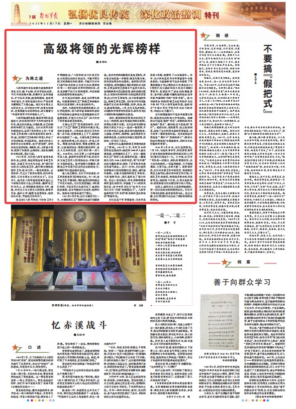 1942年5月25日,左权壮烈牺牲。7月3日,与他共事多年、时任晋察冀军区司令员的聂荣臻在《晋察冀日报》上刊发《祭左权同志》一文。文中说,左权对“军队的一切建设,部队的管理教育,战斗战役的组织,一切运筹帷幄,无不精细周详,大事不忘,小事不忽”。聂荣臻评价,左权对日常工作中的负责,绝非敷衍苟且之徒可比;他对司令部工作计划,对部队工作的指示,绝非说多做少的清谈家可比;他的精干朴素、实事求是的精神,更绝非虚设机构摆空架子的人可比。