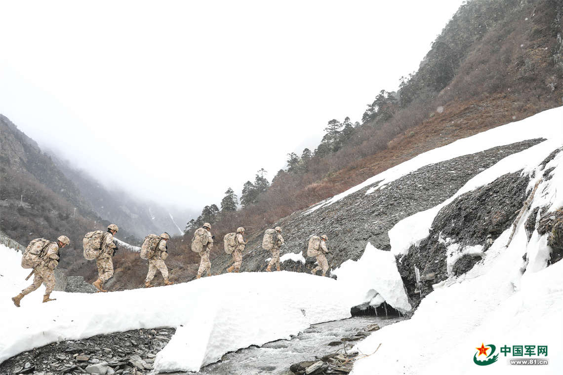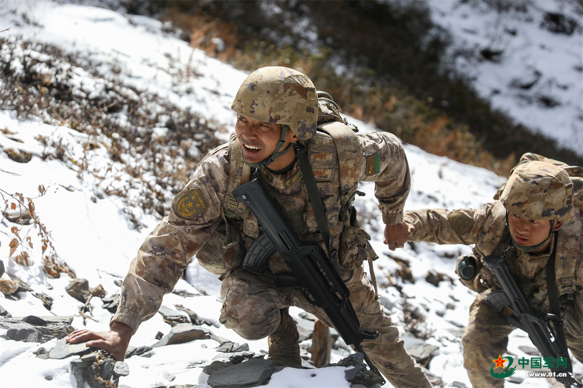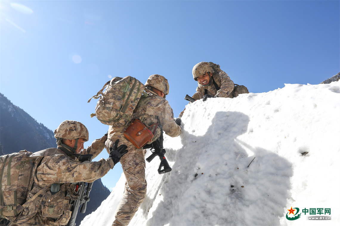 △次罗布(右一)与战友们互帮互助爬冰卧雪。