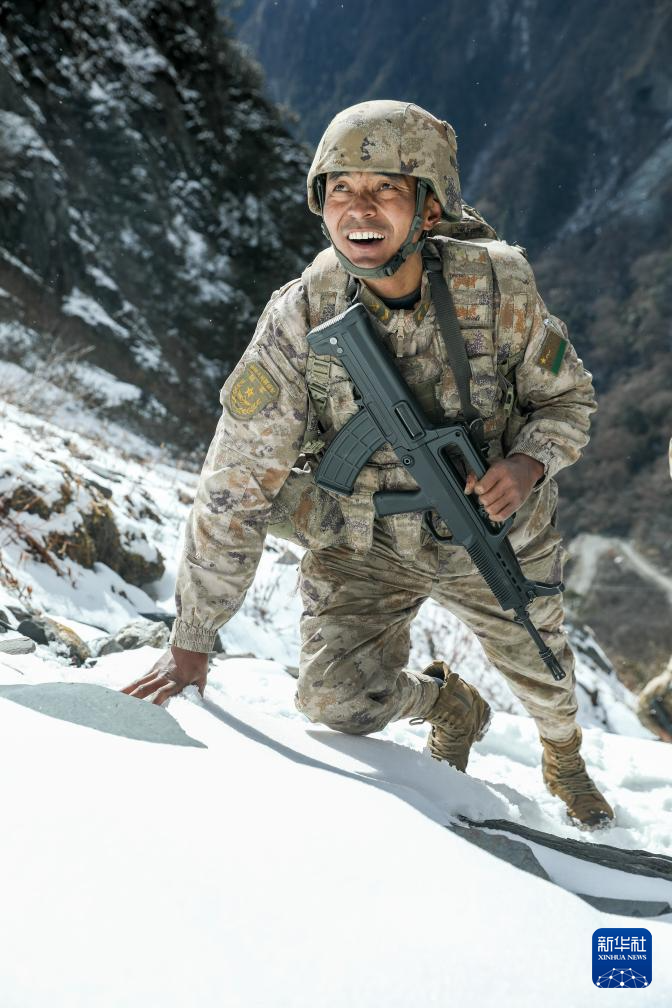 2024年1月5日,巡逻途中,西藏军区某团一级上士次罗布和战友们翻越雪山。新华社发(张照杰 摄)