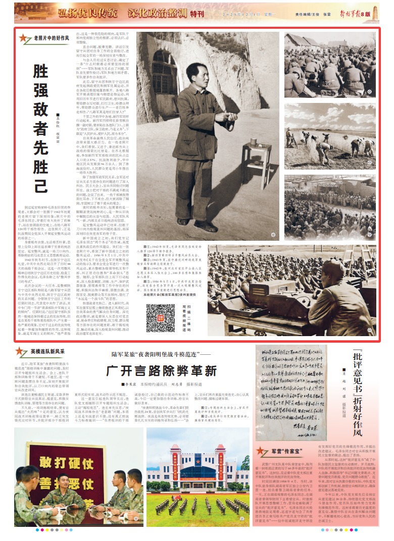 新中国成立之初,我们党牢记毛泽东同志“两个务必”的告诫,高度注重执政后的作风建设。我们在一张老照片中,看到了新中国成立之初的整风运动。1950年5月1日,中共中央发布《关于在全党全军开展整风运动的指示》,要求全党全军进行一次整风运动,重点整顿各级领导机关和干部,纠正居功自傲和“革命到头”思想。随即,全军部队自上而下行动起来,深入检查剿匪、训练、生产、保护武器装备、管理教育等工作中存在的问题,积极纠治和平麻痹、骄傲自满、贪图享受、脱离群众等不良倾向,强化了“永远是一个战斗队”的思想。