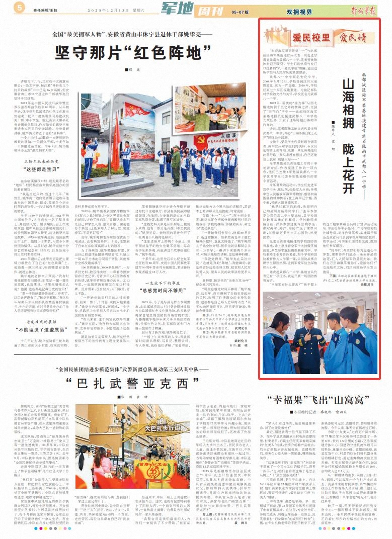 走进由该基地援建的学校国防教育基地,墙上悬挂着全军十大挂像英模画像,多型海军舰艇模型展陈其中。学校教师李条芳告诉笔者,如今学校将国防教育作为入学第一课,以国防故事点燃学生报国热情,让拥军爱军信念深植师生心中。