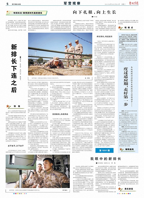 王副主任:新排长下连后遇到的挑战是方方面面的。例如角色转换的压力,从被管理者变为管理者,融入集体的同时更要快速建立威信、带起队伍;带兵本领的差距,院校成绩优异不能与基层表现出色完全画等号;还有环境变化的不适,基层事务千头万绪,考验工作方法和干事劲头。