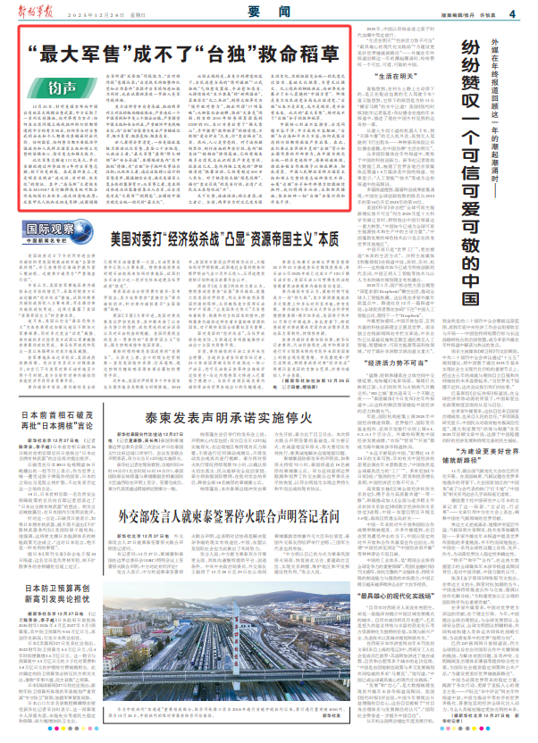 天下大势,浩浩汤汤;顺之者昌,逆之者亡。当前,两岸实力对比已发生根本性变化,实现祖国完全统一的民意无比坚实、基础无比雄厚、力量无比强大。九三阅兵的钢铁洪流,向世界充分展示了令人震撼的“中国力量”。即便是美方及民进党当局也应该清楚,“台独”从来不是历史,也不是现实,更不会有未来。此次的“最大军售”,绝对成不了“台独”分子的救命稻草。