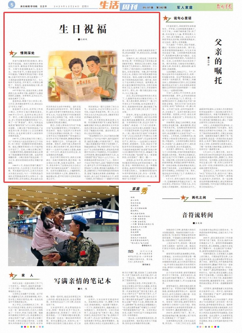 没想到,近70年里,我们的小家会和《解放军报》有这样奇妙的缘分。我想,那是一种深情的向往,是一种慢慢的靠近,是将对军营深深的情感撒向一片承接它的热土。在《解放军报》创刊70周年即将到来之际,身为一名军嫂、兵妈妈,我想代表我们的小家,送上真挚的“生日祝福”……