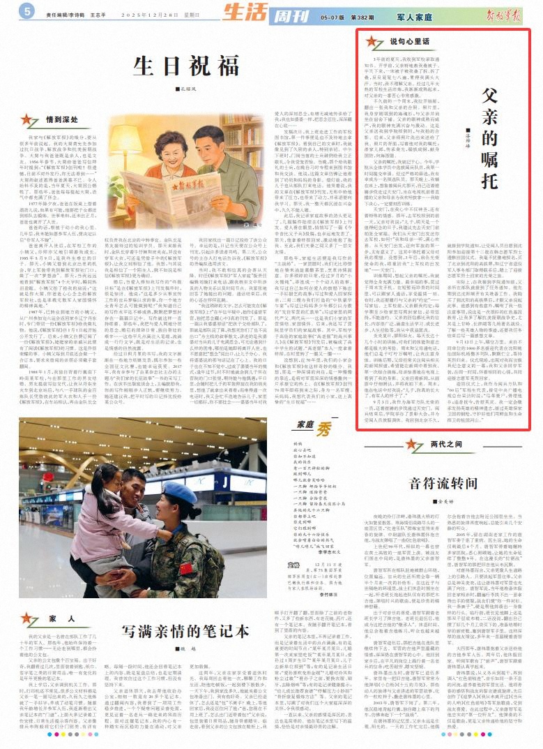 训练期间,想起父亲的嘱托,我就觉得全身充满力量。最幸福的事,莫过于周末发手机。在短暂而珍贵的时间里,可以跟家人通话,享受温情一刻。有时,我还要履行与父亲的“约定”——写家信。上军校前,父亲跟我约定:每学期至少给家里写两封家信,必须坚持,不能违约。父亲的回信都比我的信长,内容很广泛,涵盖生活学习、成长进步、人生经验等,我从中获益匪浅。