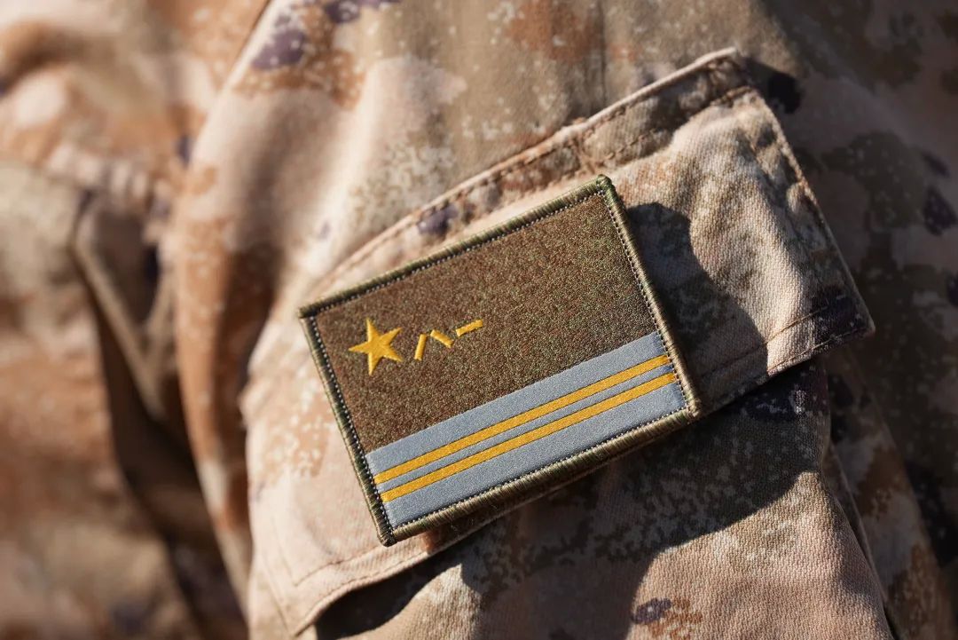 军旗臂章上半部保持解放军军旗旗面基本式样,下半部为赛博灰镶嵌金黄色条,象征制胜无形疆场。