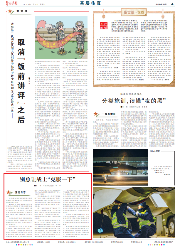 “虽然伤得不重,但这种情况原本可以避免。”于指导员告诉大家,日常工作中,部分带兵人出于各种考虑,面对战士的诉求,总把“克服一下”挂在嘴边,这种做法并不可取。“我们当然应该培养战士不畏艰难、敢于攻坚的勇气,但打着‘磨练战士’的幌子,能当下解决的拖着不办、能本级解决的不去解决、能协调上级的不去作为,便是失职。长此以往,不仅有损干部骨干威信形象,还会影响内部关系。”于指导员再次表明态度。