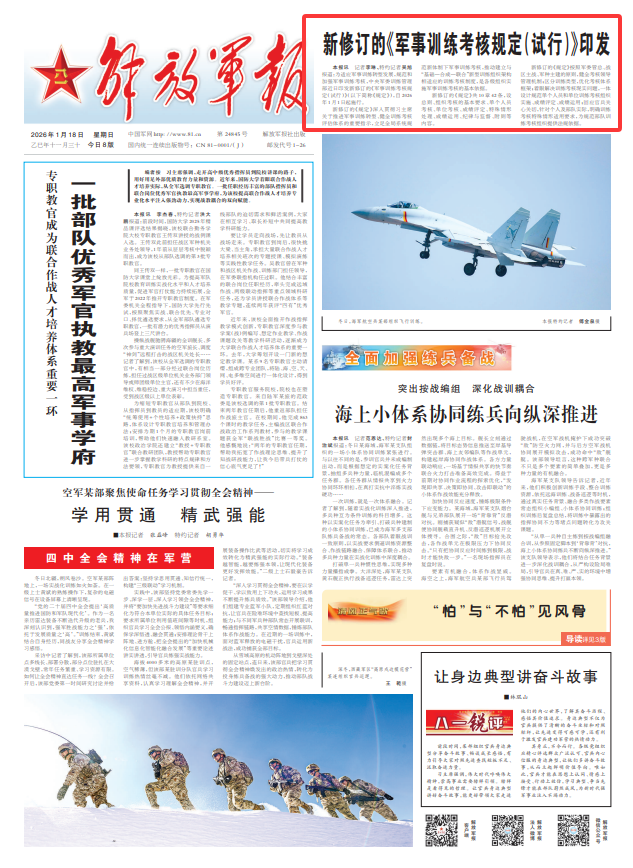 解放军报讯 记者李琳、特约记者吴旭报道:为适应军事训练转型发展,规范和加强军事训练考核,中央军委训练管理部近日印发新修订的《军事训练考核规定(试行)》(以下简称《规定》),自2026年1月1日起施行。
