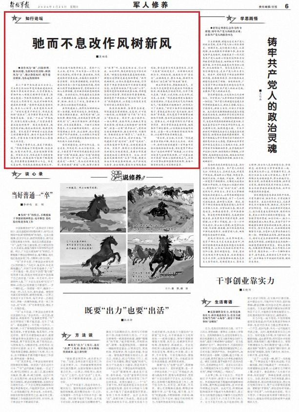 在二十届中央纪委五次全会上,习主席总结2025年党风廉政建设和反腐败斗争成效时指出,扎实开展深入贯彻中央八项规定精神学习教育,推动全党进一步改作风树新风。这既是对过往工作的肯定,也是对加强作风建设的再部署。“党的作风就是党的形象,关系人心向背,关系党的生死存亡。”对军队党员干部而言,作风是党性的“试金石”,关乎强军事业兴衰、战场胜负成败。当前,“十五五”开局起步、攻坚之战深入推进,广大官兵肩负着沉甸甸的使命。越是任务艰巨,越需作风护航;越是征程壮阔,越要清风涤荡。军队党员干部唯有以永远在路上的清醒和坚定,驰而不息改作风树新风,才能为奋斗强军持续注入蓬勃向上的力量。