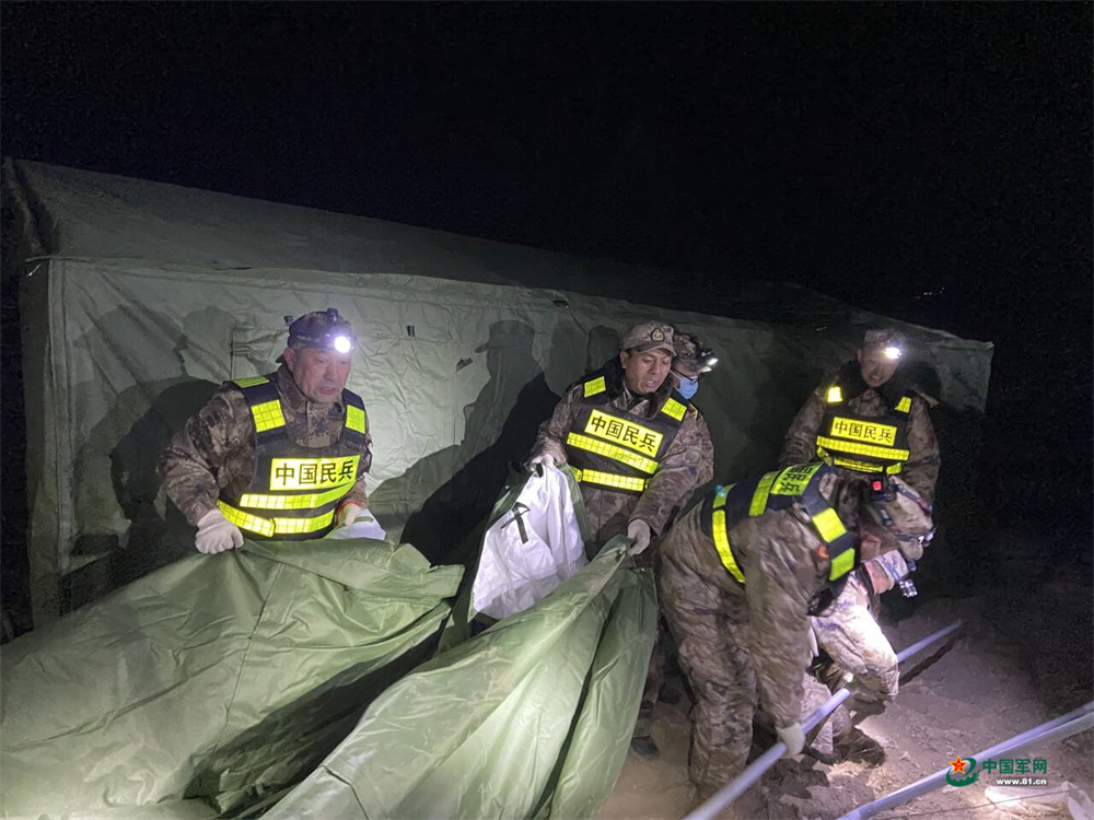 不远处的空旷平地上,另一束微光始终不熄。光晕中,传来金属支架对接的“咔哒”声、地钉砸入冻土的“砰砰”声,在寒夜里格外清晰。民兵包毅和战友拉帆布、固支架、紧绳索,动作利落。“我们加快一点,乡亲们就少挨一点冻!”他搓搓手,一锤将地钉深深砸进冻土。一顶顶军绿色应急帐篷在雪地里次第立起,包毅瞥见一位裹着厚毯的老人独坐角落,便快步走过去,蹲下身,握住老人冰凉的手,把怀里揣着的热干粮轻轻递过去:“老人家放心,炉子马上生好,我们一直都在。”