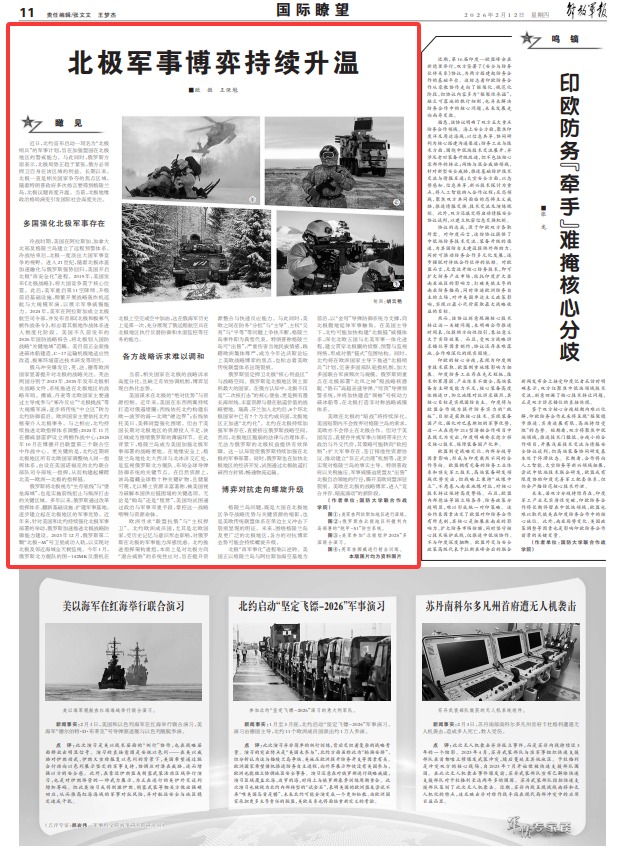 冷战时期,美国在阿拉斯加、加拿大北部及格陵兰岛建立了远程预警体系。冷战结束后,北极一度淡出大国军事竞争的视野。进入21世纪,随着北极冰盖加速融化与俄罗斯强势回归,美国开启北极“再安全化”进程。2019年,美国发布《北极战略》,将大国竞争置于核心位置。此后,美军重启第11空降师、升级前沿基础设施,频繁开展战略轰炸机巡航与大规模军演,以展示军事威慑能力。2024年,美军在阿拉斯加成立北极航空司令部,并发布首部《北极和极寒气候作战条令》,标志着其极地作战体系进入制度化阶段。美国不久前发布的2026年国防战略报告,将北极划入国防战略“关键地域”范畴。美目前正全面推进破冰船建造、C-17运输机极地适应性改造、极寒环境雷达技术研发等项目。