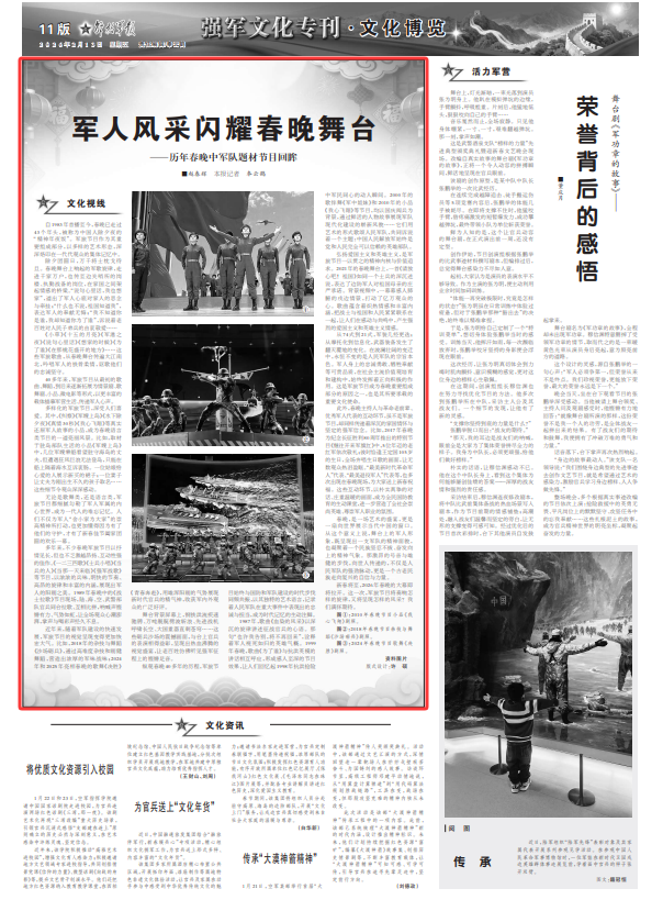 纵观春晚40多年的历程,军旅节目始终与国防和军队建设的时代步伐同频共振,以其独特的艺术语言,记录着人民军队在重大事件中表现出的忠诚与担当,成为时代记忆的生动注脚。