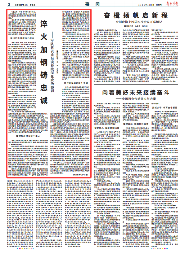 今年是“十五五”开局之年,也是打好实现建军一百年奋斗目标攻坚战的关键一年。军队代表委员表示,在这样的关键当口,我们一定要更加紧密地团结在以习近平同志为核心的党中央周围,通过持续深化政治整训,把担当作为充分展现出来,以踔厉奋发、务期必成的精神状态,向党和人民交出优异答卷。
