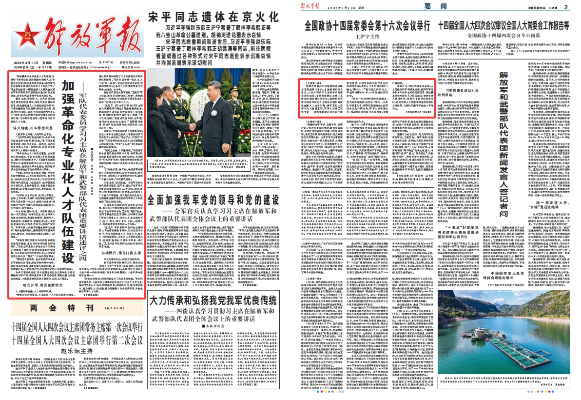 “要加强革命化专业化人才队伍建设,坚持不懈用党的创新理论铸魂育人,打牢官兵听党话、跟党走的思想根基,确保现代化武器装备掌握在革命化人才队伍手中。”习主席在出席十四届全国人大四次会议解放军和武警部队代表团全体会议时的重要讲话,在军队代表委员中引发热烈反响。