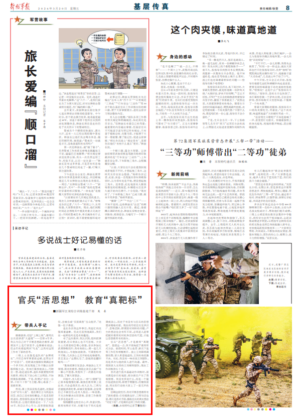 官兵“活思想”,才是教育“真靶标”。想清这一点,我不再拘泥于教育形式方法。前段时间,军士选晋、新兵下连等工作任务相继展开。战士王剑即将满服役期,家人希望他退役,王剑有些犹豫不决。对此,我没有一味劝说王剑留队,而是多次与他的家人进行沟通。最终,得到家人支持的王剑顺利留队,现在工作训练劲头十足。