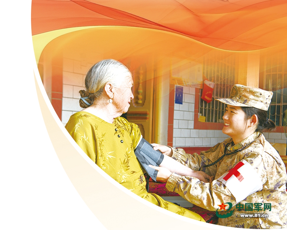 连队卫生员为共建村老人量血压。刘帅博摄