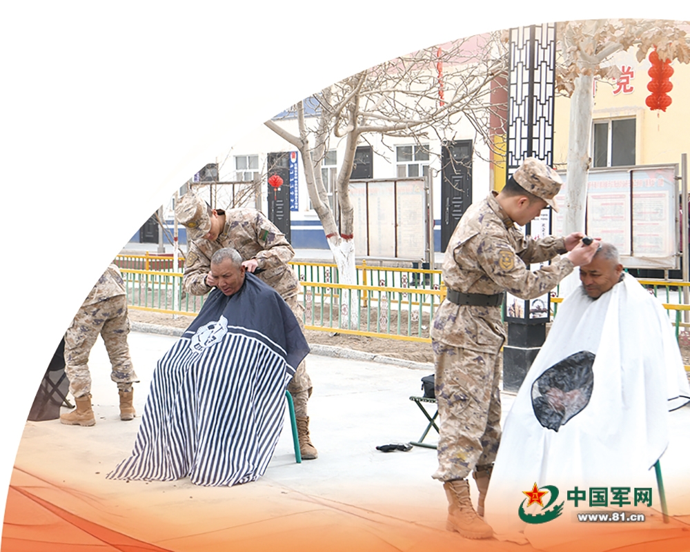 连队官兵为共建村村民理发。刘帅博摄