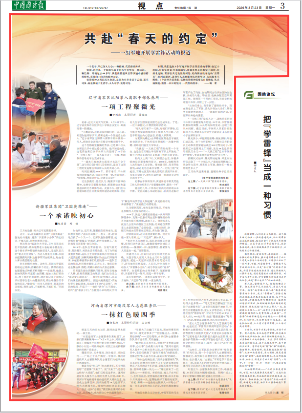 本期,我们选取3个军地开展学雷锋活动的事例:在辽宁沈阳,官兵坚持21年捐资助学,用微光照亮困难学子前程;在西北边陲,某部官兵无论驻防何处,始终做百姓身边的“雷锋兵”;在河南漯河,退役军人志愿服务队四季坚守,为民服务不断线。3个故事告诉我们,弘扬雷锋精神需要从自我做起、从点滴做起,需要一日日的坚守、一代代的传承。