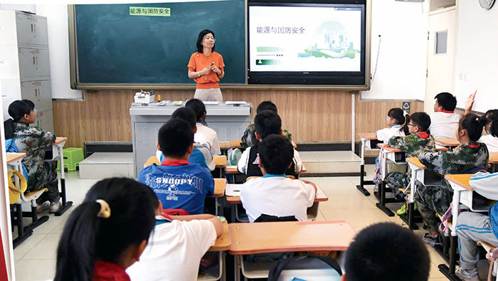国防教育课上,北京市平谷区第一小学学生学习能源安全知识,提升国家安全意识和国防观念。