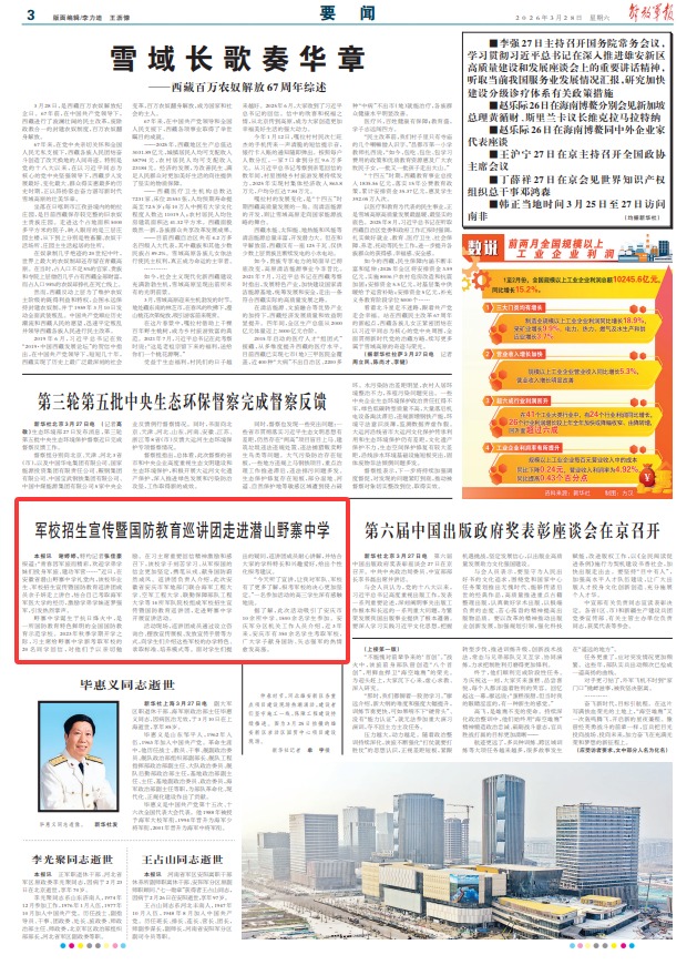 野寨中学诞生于抗日烽火中,是一所国防教育特色鲜明的全国国防教育示范学校。2023年秋季学期开学之际,习主席给野寨中学新考取军校的20名同学回信,对他们予以亲切勉励。在习主席重要回信精神激励和感召下,该校学子刻苦学习、从军报国的信念更加坚定,携笔从戎、献身国防蔚然成风。巡讲团负责人介绍,此次安徽省安庆市军地部门联合海军工程大学、空军工程大学、联勤保障部队工程大学等14所军队院校组成军校招生宣传暨国防教育巡讲团,走进野寨中学开展宣讲活动。