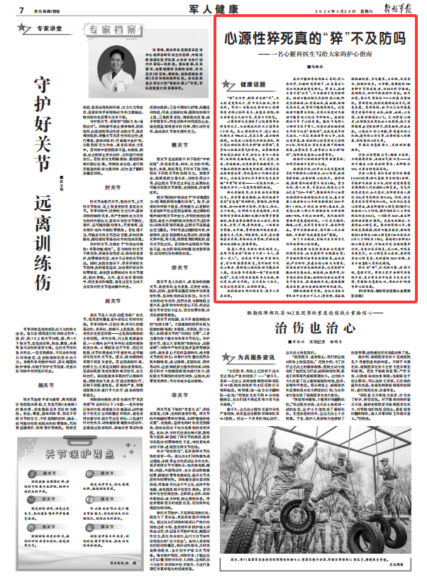 预防比抢救更重要。建议大家在日常生活中注意以下几点:管住嘴,低盐低脂低糖饮食,多吃蔬果、全谷物、优质蛋白,控制好体重。迈开腿,每周进行150分钟中等强度运动,但切记科学运动。戒烟限酒,任何年龄戒烟都有益。睡个好觉,每日尽量保证7~8小时高质量睡眠。管理情绪,找到健康的减压方式,避免焦虑。定期体检,40岁以上或有高危因素者每年检查血压、血脂、血糖、心电图,必要时做冠脉CT。已确诊冠心病者,必须规范使用抗血小板药物、他汀类降脂药、β受体阻滞剂,稳定斑块、防止血栓。心梗后评估心功能,警惕遗传性心肌病、遗传性心律失常,必要时植入除颤器,预防恶性心律失常。