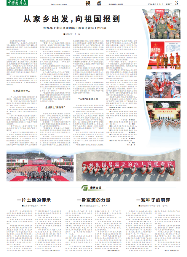 江西于都,长征渡口旁,新兵饮尽家乡亲人递上的“初心水”,从“长征源”踏上属于自己的“长征路”;重庆铜梁,邱少云烈士雕像前,抗美援朝老兵为新兵讲述烈火中永生的故事,一句“我是邱少云家乡的新兵”,是誓言,更是血脉的赓续;浙江德清,红色主题短视频创作大赛颁奖典礼与新兵欢送会同步举行,新兵在科技与文化的交融中传承红色基因……