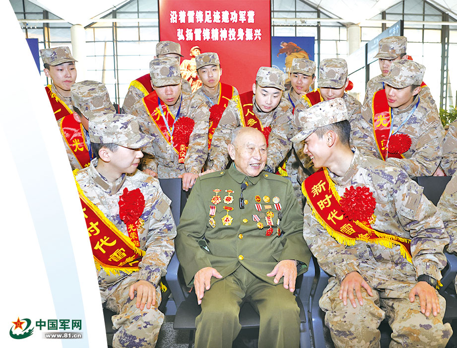 雷锋生前战友曾国兴(中)来到机场送别新兵。登机前,曾国兴为辽宁省沈阳市新兵讲述雷锋故事,勉励他们当好新时代“雷锋兵”。解放军报记者 荣俊运摄