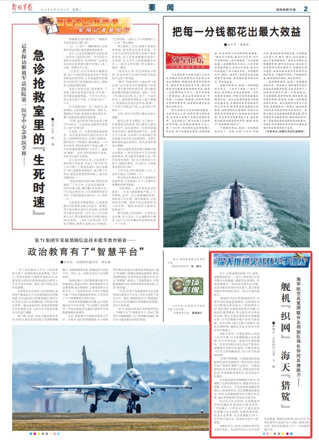 空中,反潜巡逻机掠海飞行;海面,战舰劈波斩浪……春日,海军航空兵某团联合水面舰艇、潜艇等友邻部队,在某海域展开一场协同对潜攻击训练。此次训练采取对抗形式进行,重点检验和提升参训部队海空一体化反潜作战能力。
