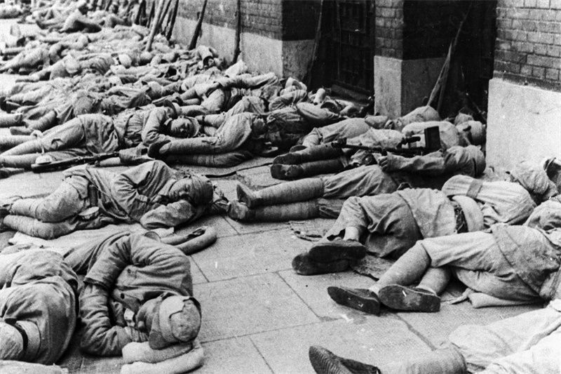 ▲解放上海后的我军官兵严格执行“不入民宅”纪律,露宿街头